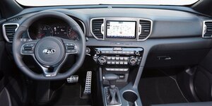 В целом салон Sportage 2016 отличается «спортивностью», но для полноценной спортивной машины у него слишком высоко расположены седушки кресел. На азартный дух модели указывает скошенный мультируль, высокая острая грань торпедо и центральная консоль, повернутая к водителю на 10 градусов. На консоли наблюдаются размещенные каскадом и обрамленные «лаком» кнопки, а также экран мультимедийного комплекса, по обеим сторонам которого красуются вертикальные дефлекторы воздуховодов с серебристой окантовкой — как у последнего Porsche Cayenne.