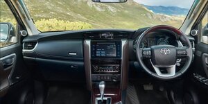 Удобства, простора и качества новому Fortuner не занимать. Его отделка интерьера достаточно качественная, но не премиальная, о чем говорит жестковатый пластик на передней панели. Козырек приборного щитка и верхняя часть бардачка обшиты натуральной кожей, да и вообще везде, где мягкие детали могут соприкасаться с телом водителя и пассажиров, применены исключительно натуральные материалы. Перчаточный ящик у новинки 2-уровневый, с функцией охлаждения верхнего отделения, которое открывается с помощью элегантной металлической кнопки с надписью «Fortuner». Как и в случае с дорогостоящими «Лэнд Крузерами», у нового внедорожника левое колено переднего пассажира и правое колено водителя защищены за счет мягких накладок, но только от острых углов центральной консоли, а не от поручней дверей — у них мягкой является лишь верхняя часть.