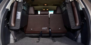 Багажник у Fortuner очень вместительный лишь в том случае, когда сложены сидения 2-го и 3-го рядов. При разложенных сиденьях объем грузового отсека невелик — не удивительно, что Toyota нигде не приводит эту цифру.