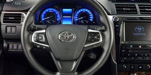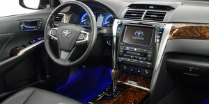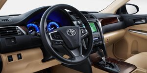 Салон Toyota Camry — настоящий островок комфорта. Там и приборная панель с многофункциональным цветным экраном, и удобные сидения с функцией подогрева, и индивидуальные лампы для чтения… Чего там только нет! Места при этом с лихвой хватает для 3-5 человек, за что стоит сказать спасибо габаритам автомобиля. В длину авто достигает 4,85 м, в ширину — 1,825 м, в высоту — 1,48 м, а расстояние между осями колес составляет 2,775 м. Клиренс — 16 см, и его достаточно, чтобы чувствовать себя уверенно.